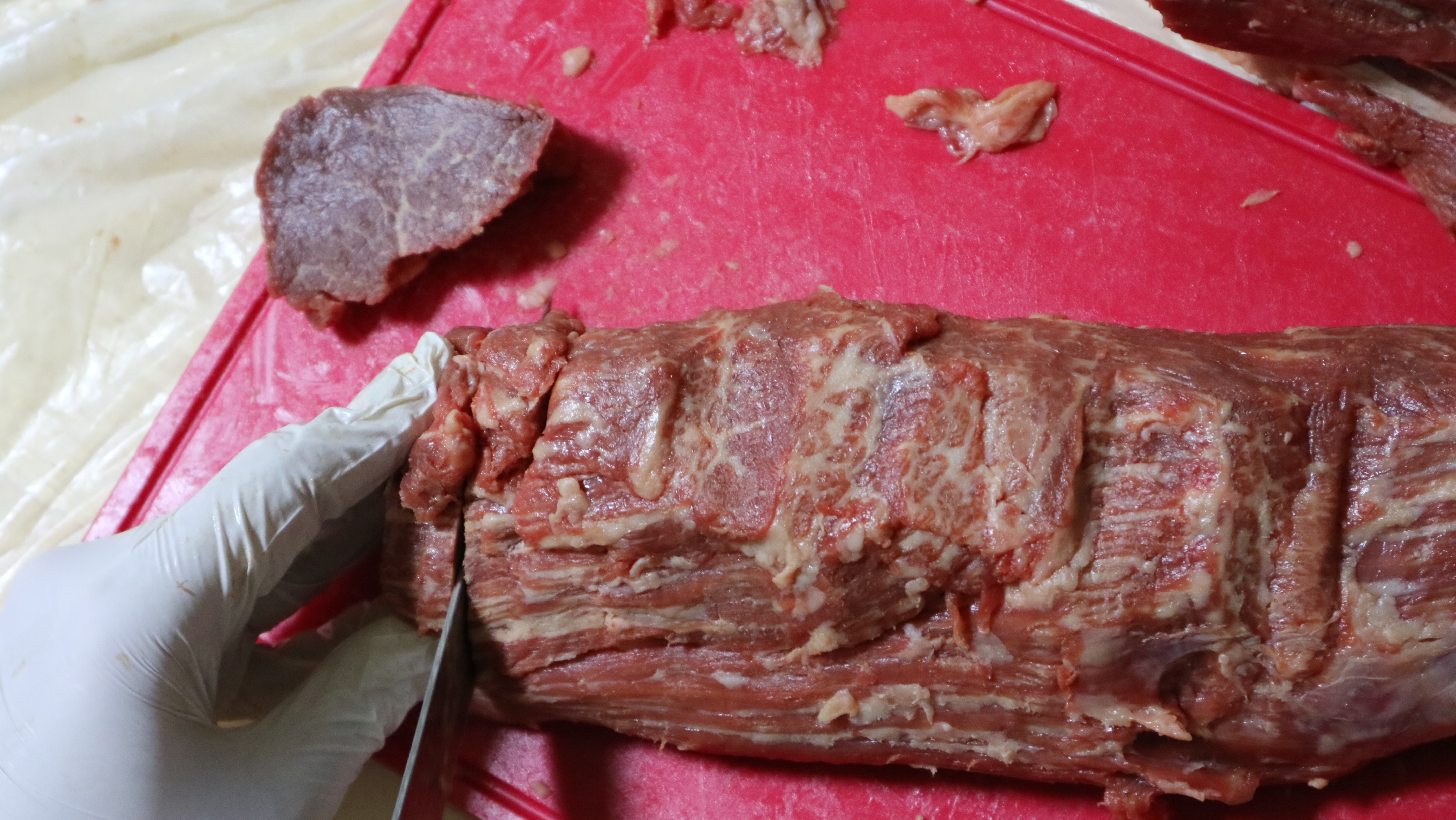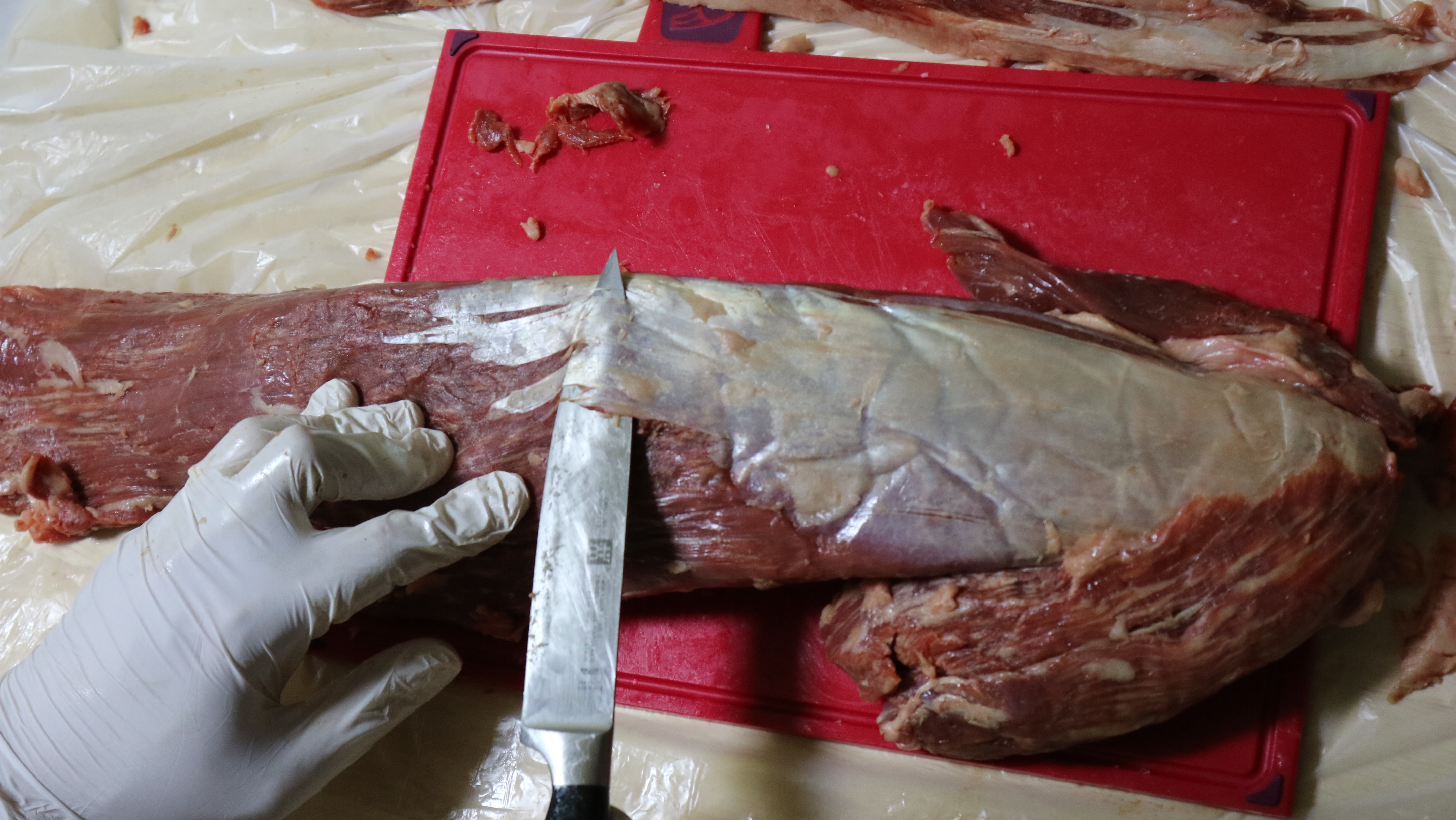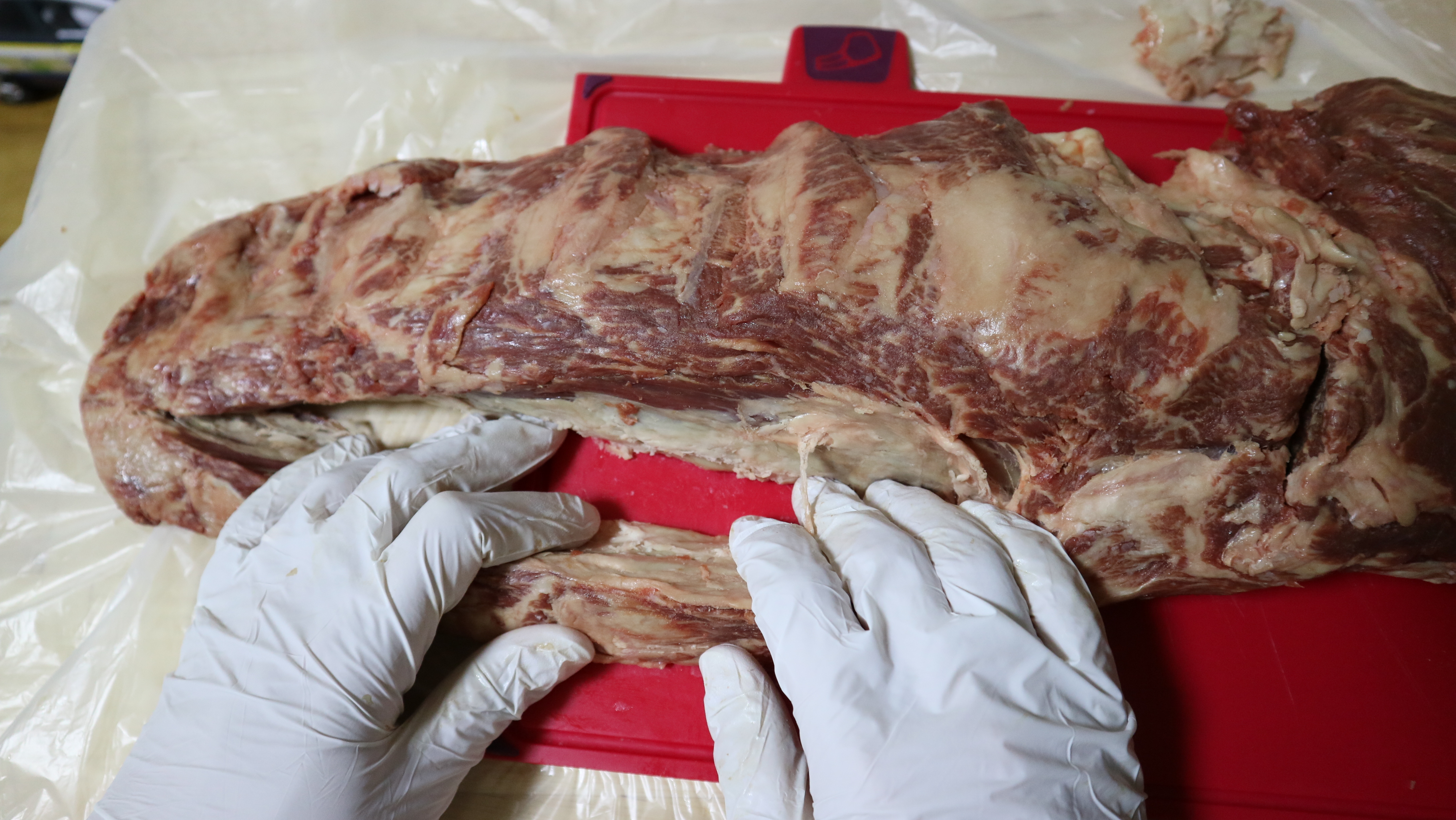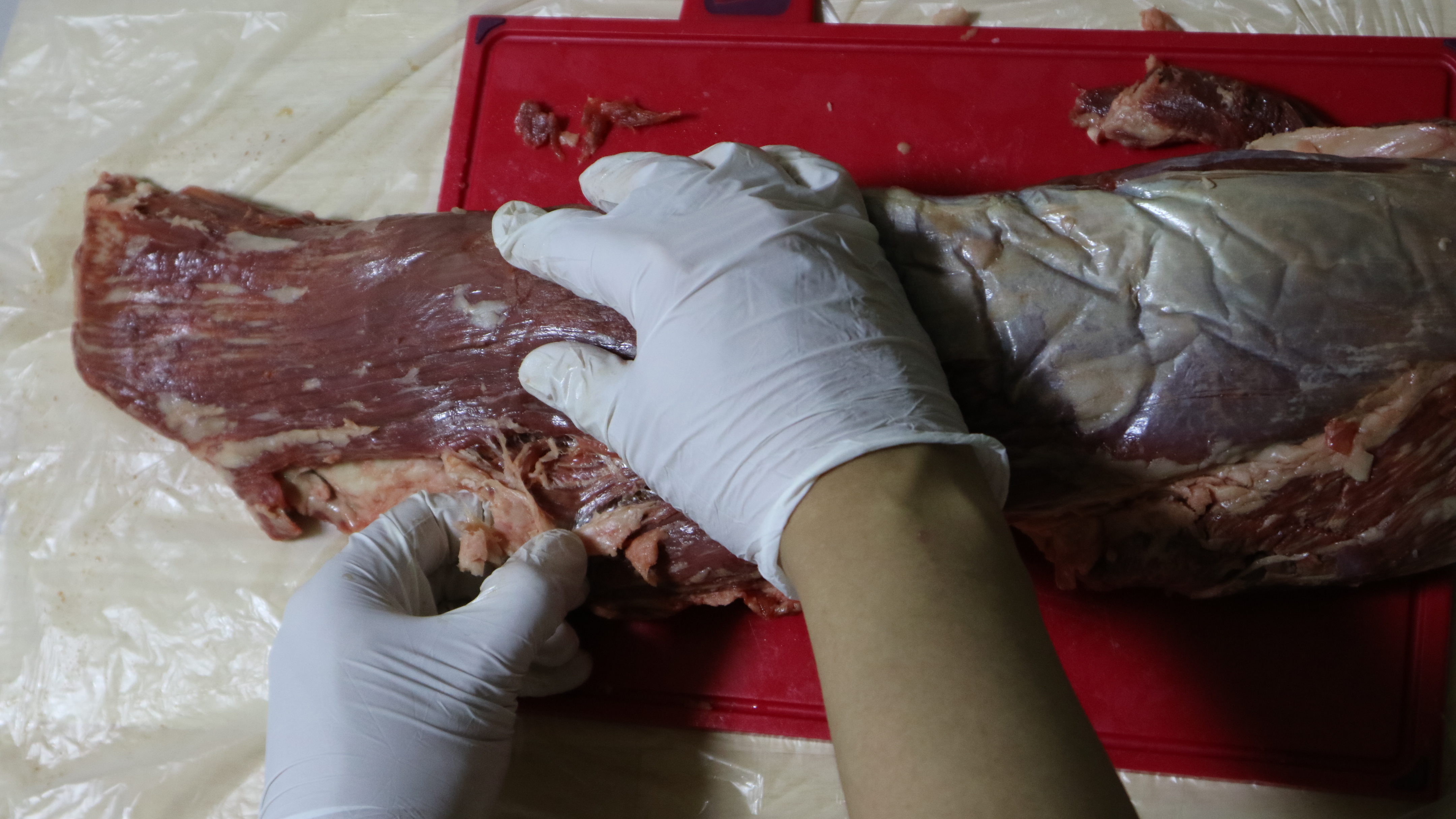 안심추리를 떼내고나면 겉에 붙어있는 스지를 제거합니다.
