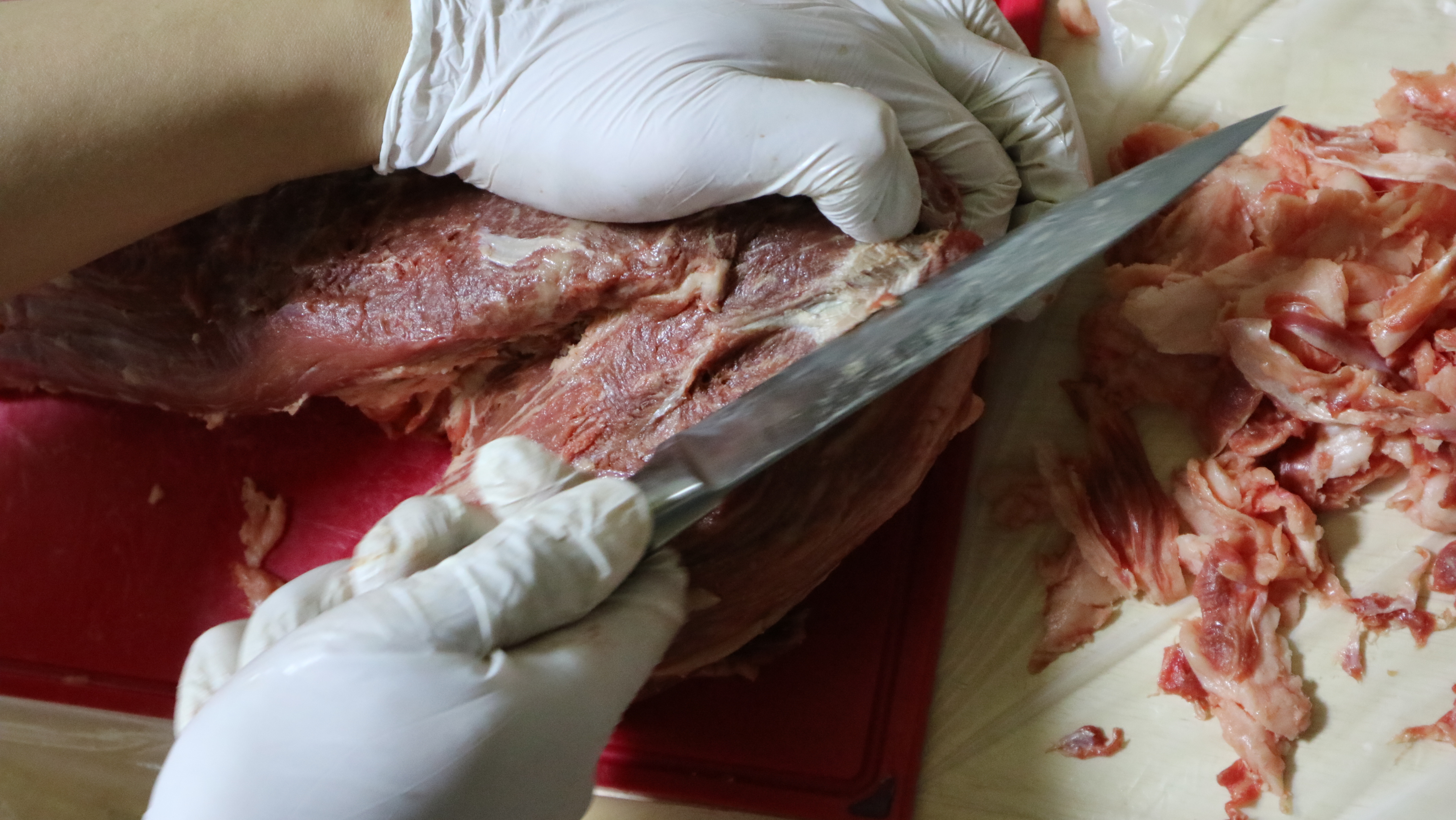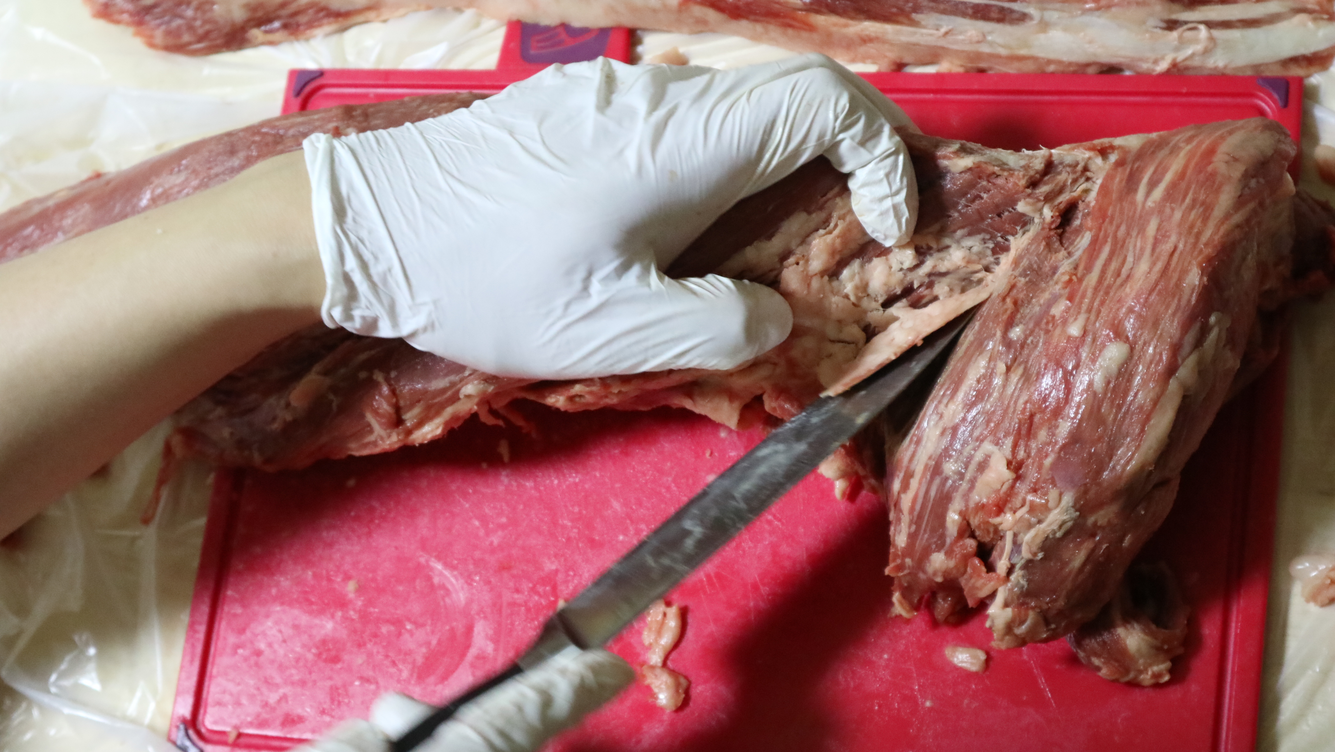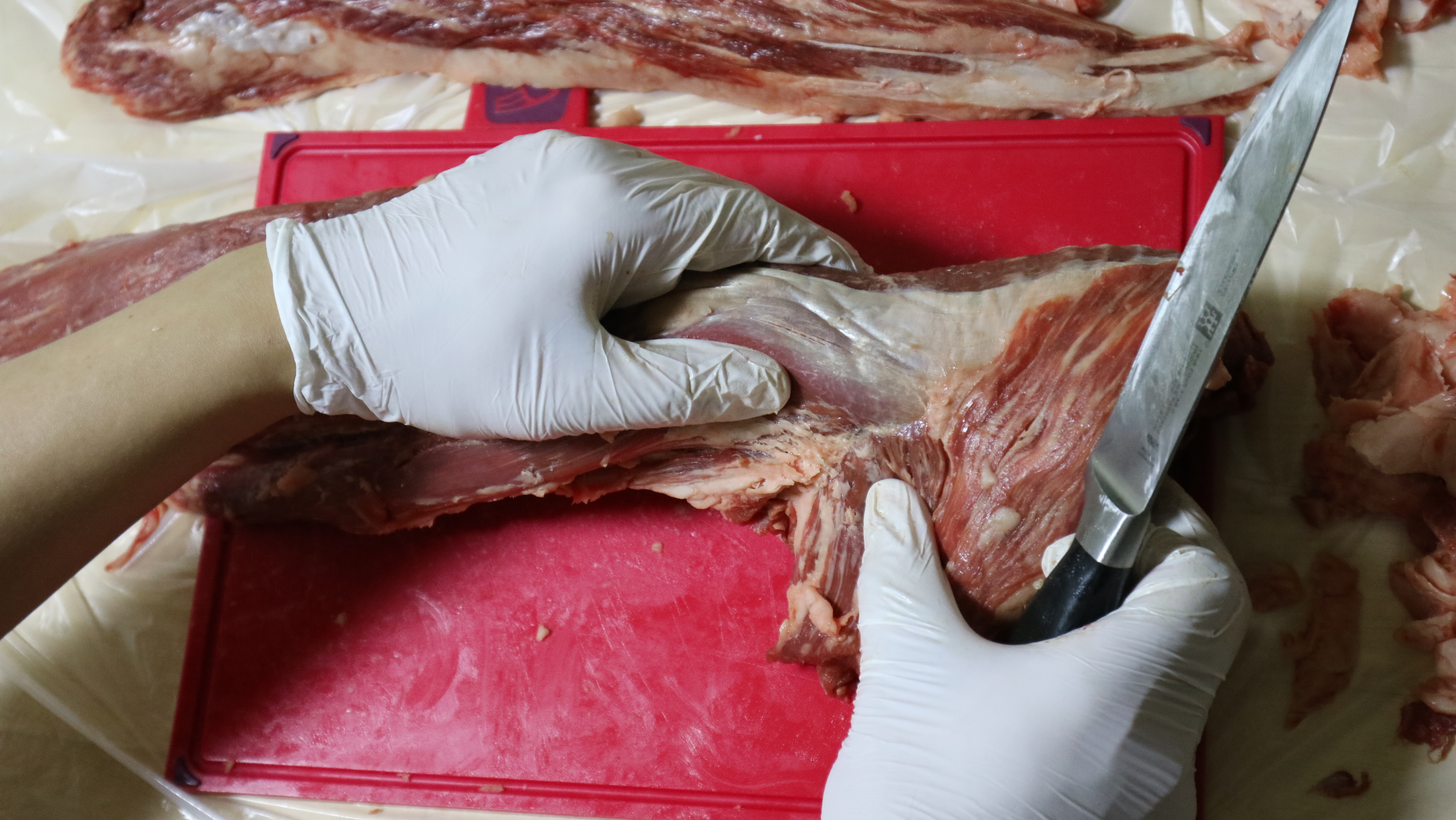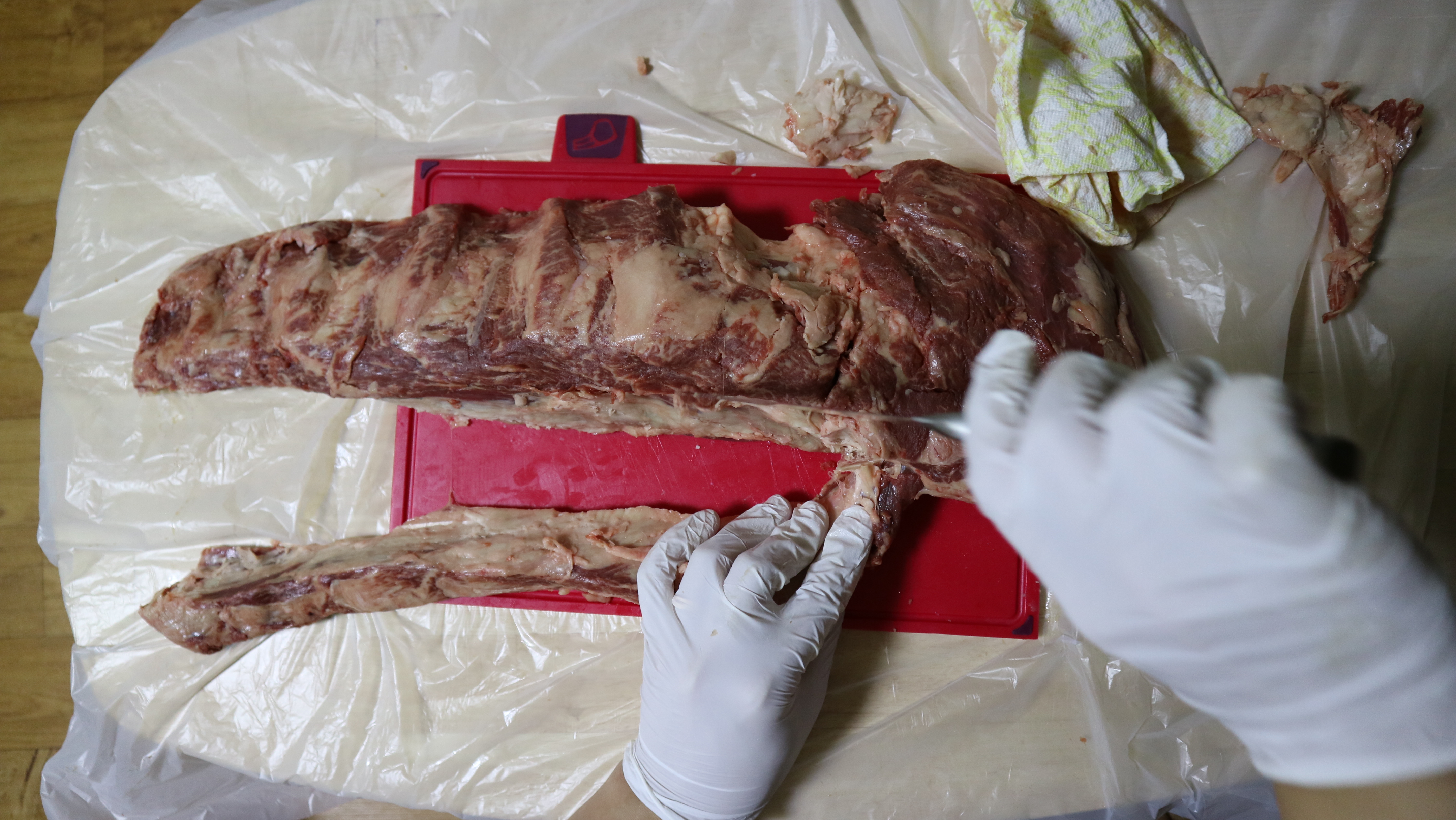 안심추리를 떼내고나면 겉에 붙어있는 스지를 제거합니다.