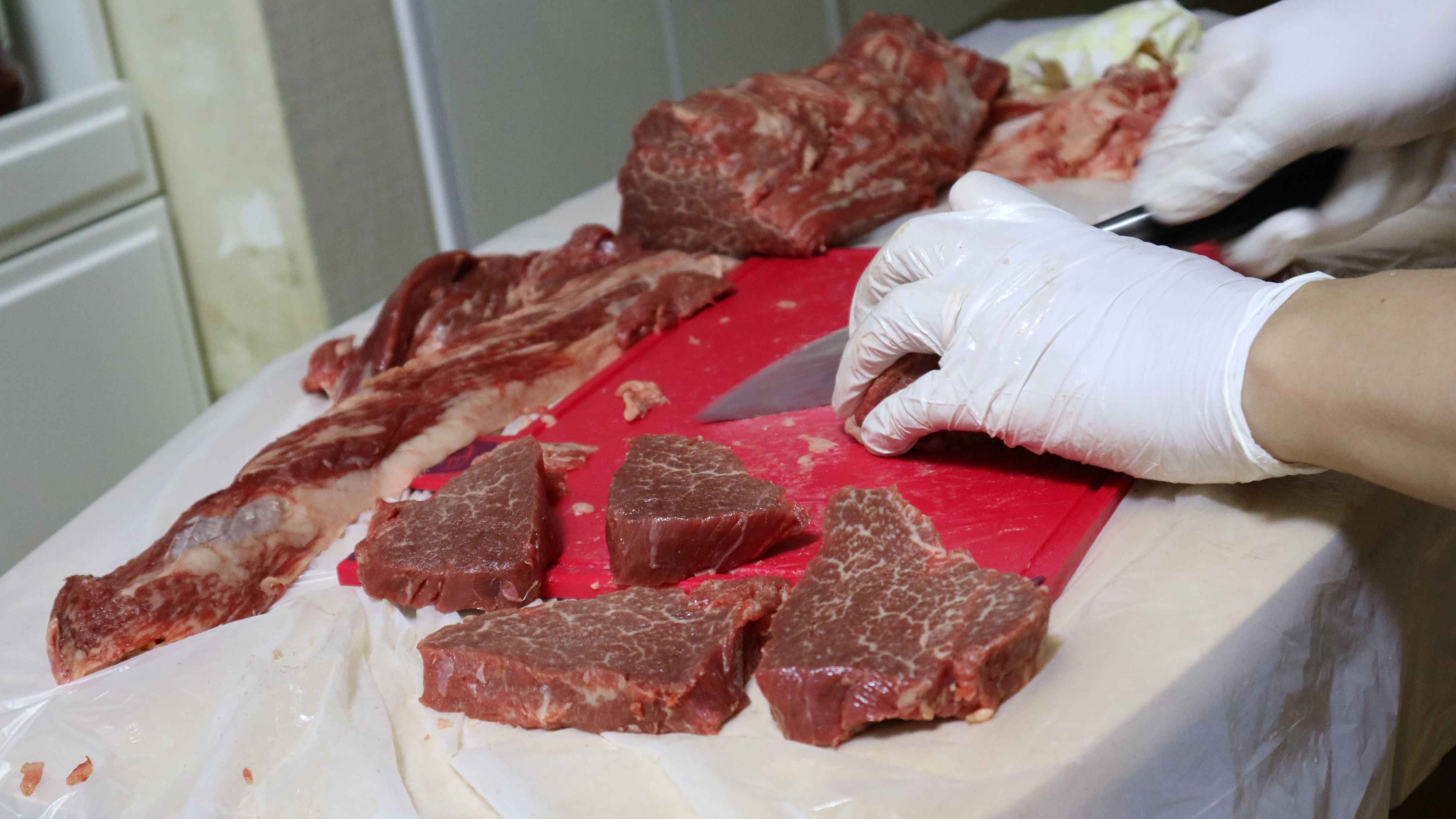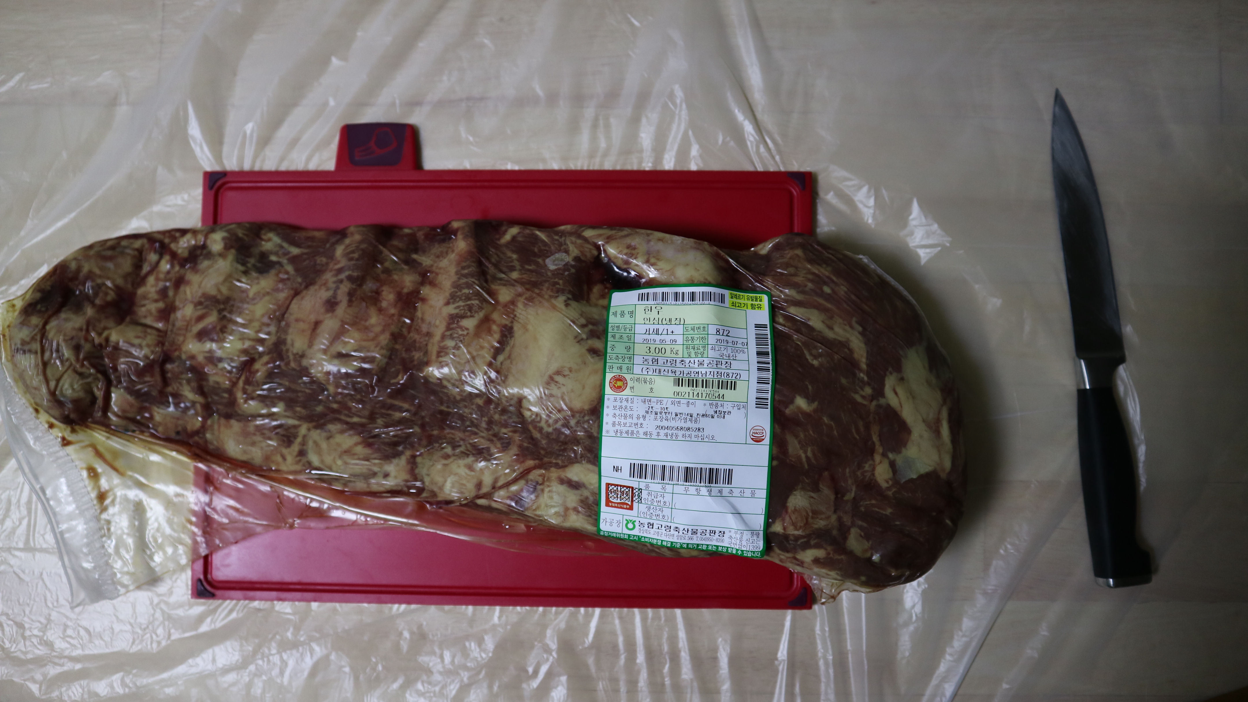 떼네고 나도 저런 지방들이 또 덕지덕지 붙어있어요. 칼 옆에 오른쪽에 뼈가 또 보이네요. 좀 가공좀 잘해주지.... 미국산도 아니고.